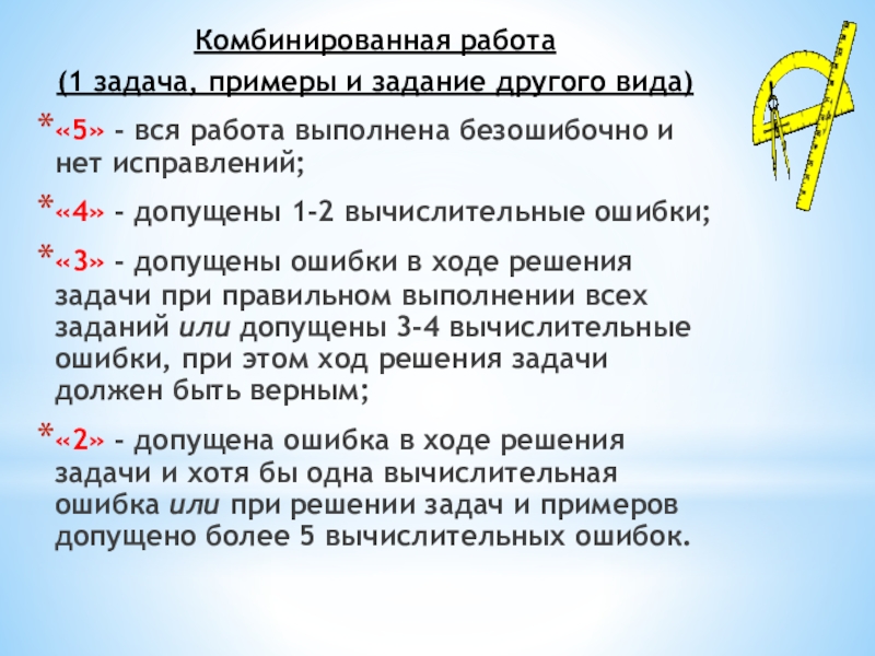 «2» - допущена ошибка в ходе решения задачи и хотя бы одна вычислительная ошибка или при решении задач и примеров допущено более 5 вычислительных ошибок.