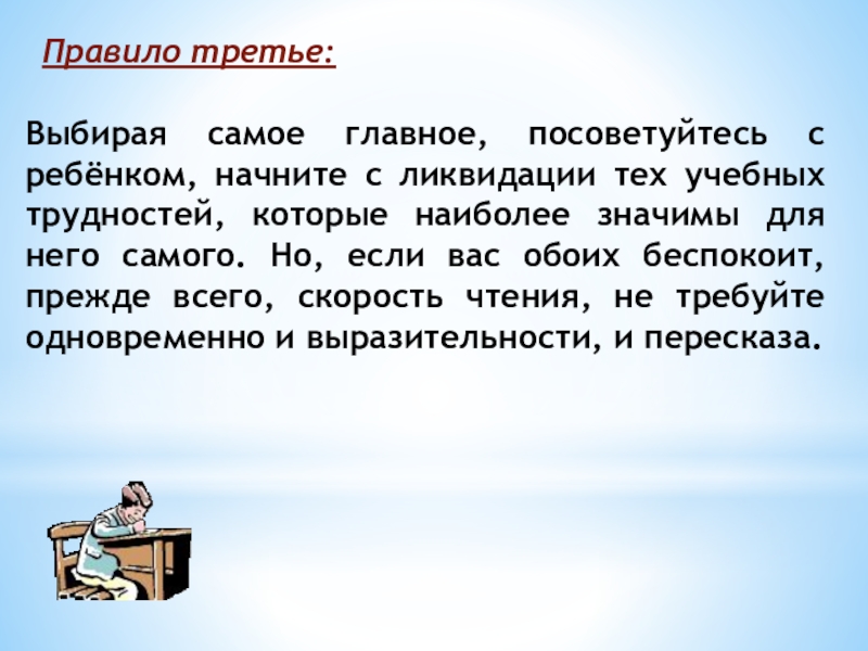 учебных трудностей, которые наиболее значимы для него самого. Но, если вас обоих беспокоит, прежде всего, скорость чтения, не требуйте одновременно и выразительности, и пересказа.