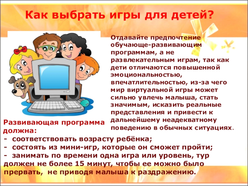 - занимать по времени одна игра или уровень, тур должен не более 15 минут, чтобы ее можно было прервать, не приводя малыша к раздражению.