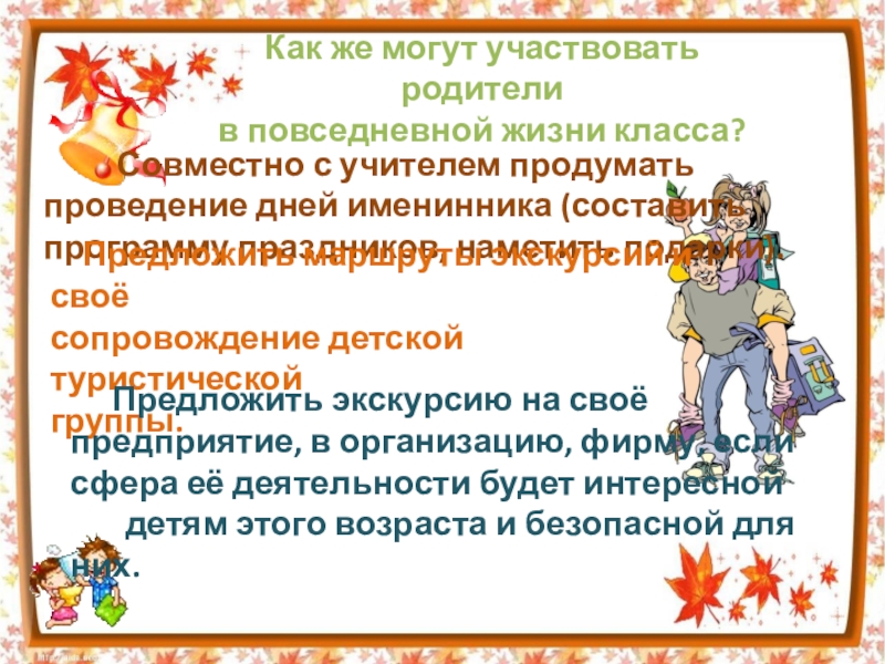 Как же могут участвовать родители в повседневной жизни класса?     Совместно с учителем продумать