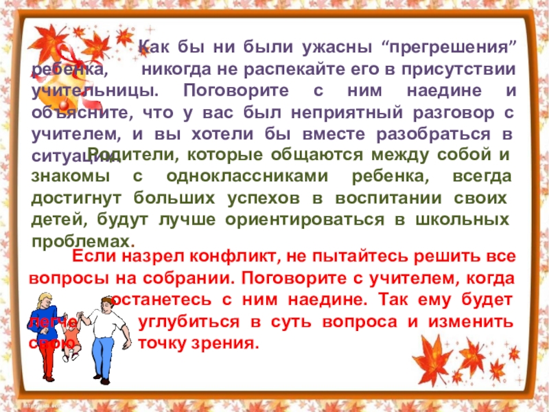 Если назрел конфликт, не пытайтесь решить все вопросы на собрании. Поговорите с учителем, когда останетесь с ним наедине. Так ему будет легче углубиться в суть вопроса и изменить свою точку зрения.