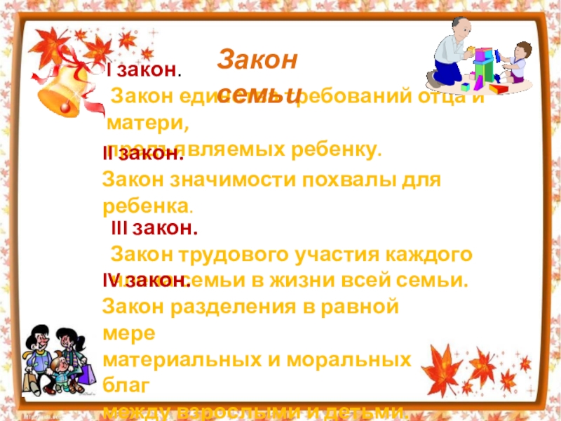 I закон. Закон единства требований отца и матери, предъявляемых ребенку.Закон семьиII закон. Закон значимости похвалы для ребенка.III