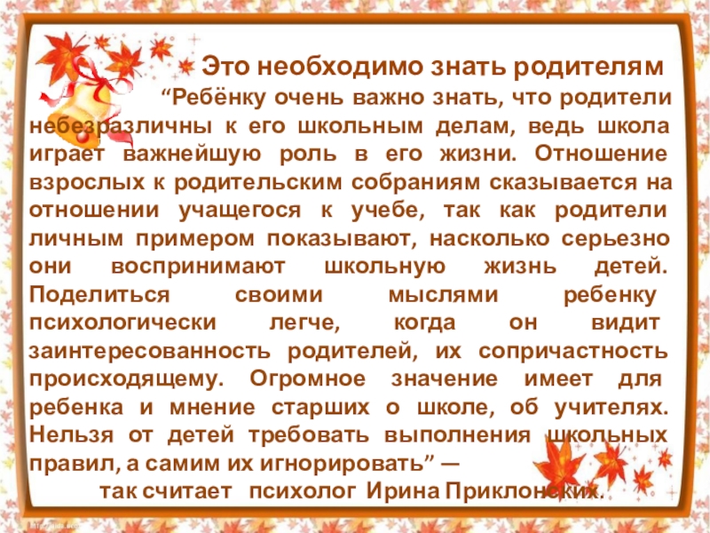 “Ребёнку очень важно знать, что родители небезразличны к его школьным делам, ведь школа играет важнейшую роль в его жизни. Отношение взрослых к родительским собраниям сказывается на отношении учащегося к учебе, так как родители личным примером показывают, насколько серьезно они воспринимают школьную жизнь детей. Поделиться своими мыслями ребенку психологически легче, когда он видит заинтересованность родителей, их сопричастность происходящему. Огромное значение имеет для ребенка и мнение старших о школе, об учителях. Нельзя от детей требовать выполнения школьных правил, а самим их игнорировать” —