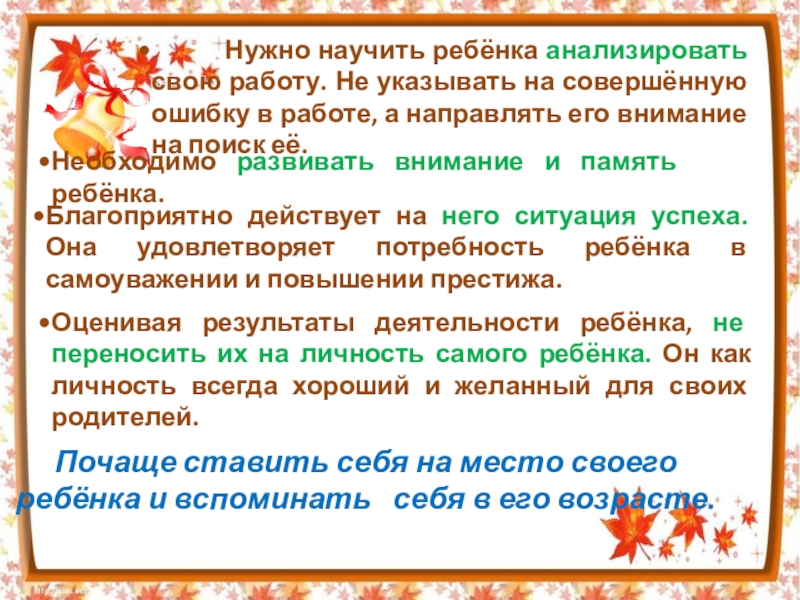 Слайд 19 Нужно научить ребёнка анализировать свою работу.