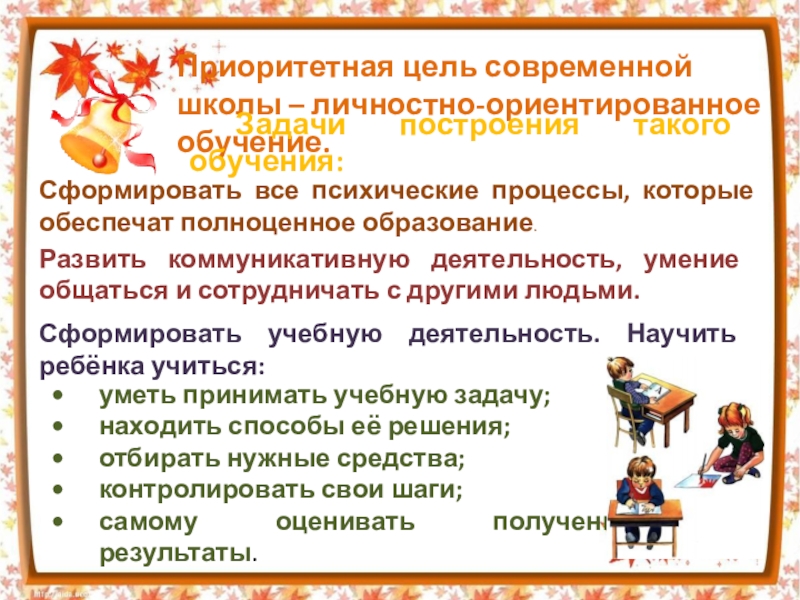 Приоритетная цель современной школы – личностно-ориентированное обучение.Задачи построения такого обучения:Сформировать все психические процессы, которые обеспечат полноценное образование.Развить
