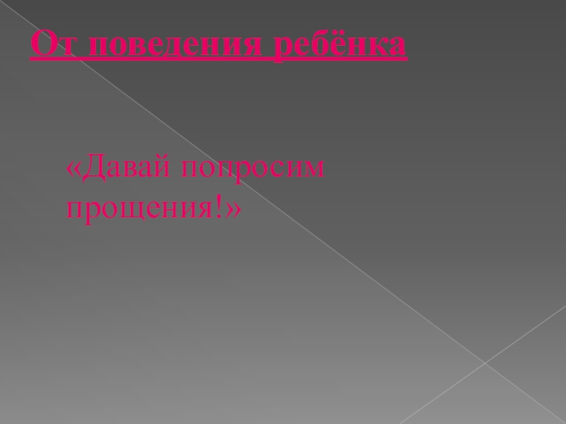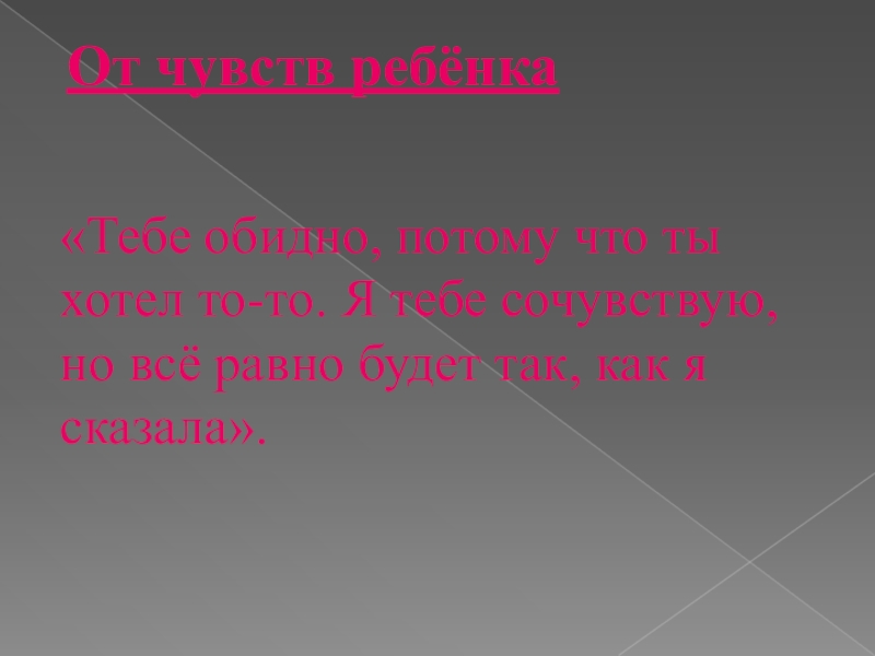 От чувств ребёнка«Тебе обидно, потому что ты хотел то-то. Я тебе сочувствую, но всё равно будет так,