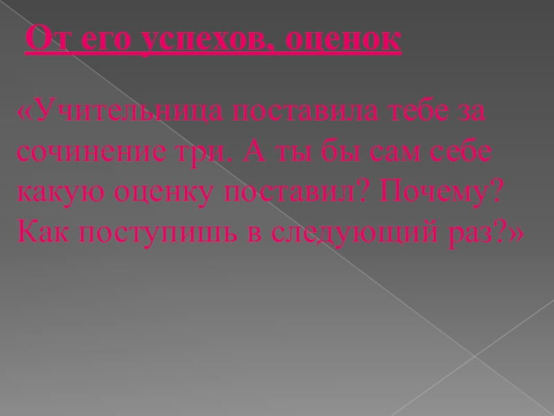 От его успехов, оценок«Учительница поставила тебе за сочинение три. А ты бы сам себе какую оценку поставил?