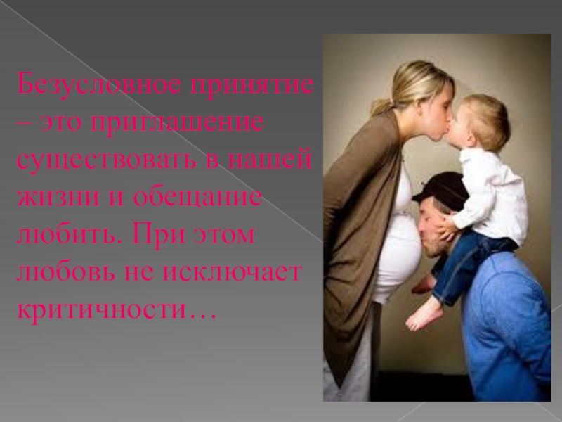Слайд 14Безусловное принятие – это приглашение существовать в нашей жизни и обещание