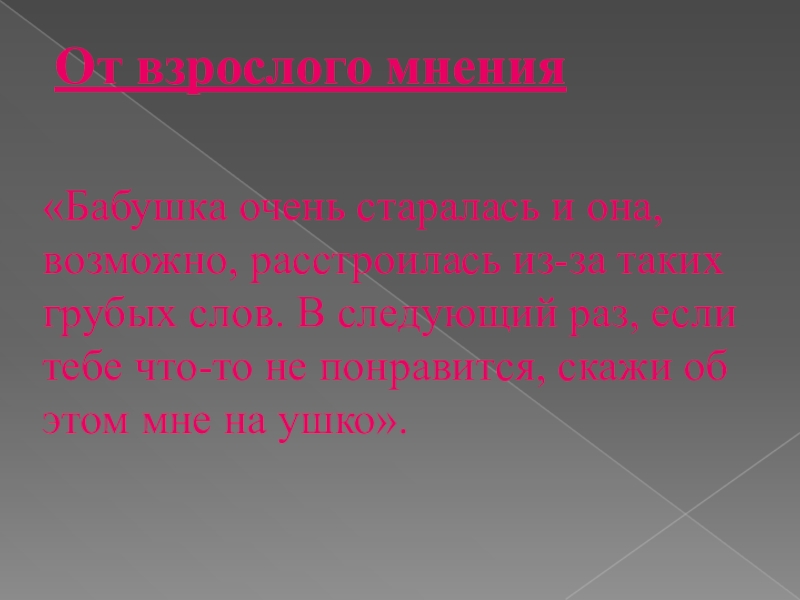 От взрослого мнения«Бабушка очень старалась и она, возможно, расстроилась из-за таких грубых слов. В следующий раз, если