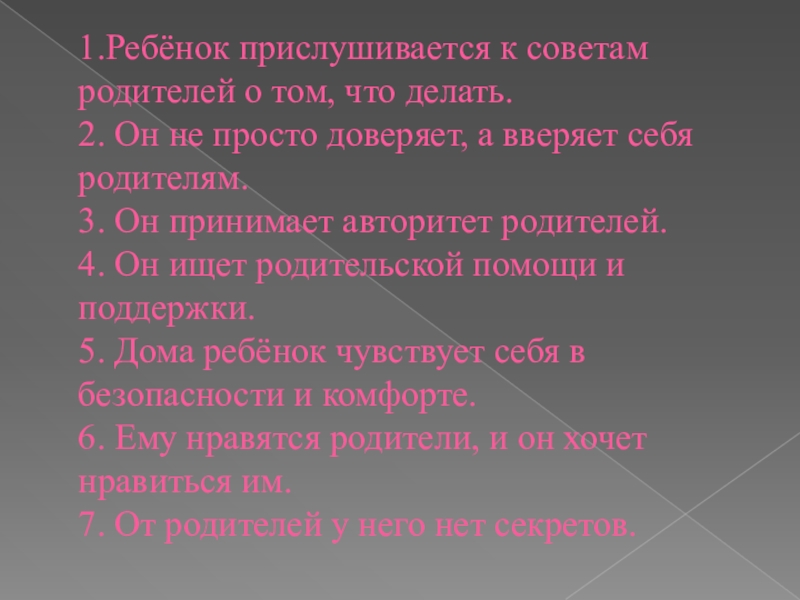 просто доверяет, а вверяет себя родителям. 3. Он принимает авторитет родителей. 4. Он ищет родительской помощи и поддержки. 5. Дома ребёнок чувствует себя в безопасности и комфорте. 6. Ему нравятся родители, и он хочет нравиться им. 7. От родителей у него нет секретов.