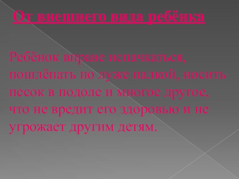 От внешнего вида ребёнкаРебёнок вправе испачкаться, пошлёпать по луже палкой, носить песок в подоле и многое другое,