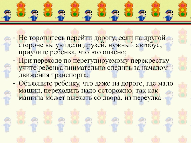 При переходе по нерегулируемому перекрестку учите ребенка внимательно следить за началом движения транспорта;