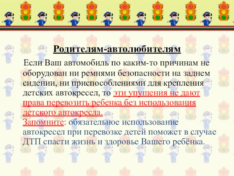 Запомните: обязательное использование автокресел при перевозке детей поможет в случае ДТП спасти жизнь и здоровье Вашего ребёнка.