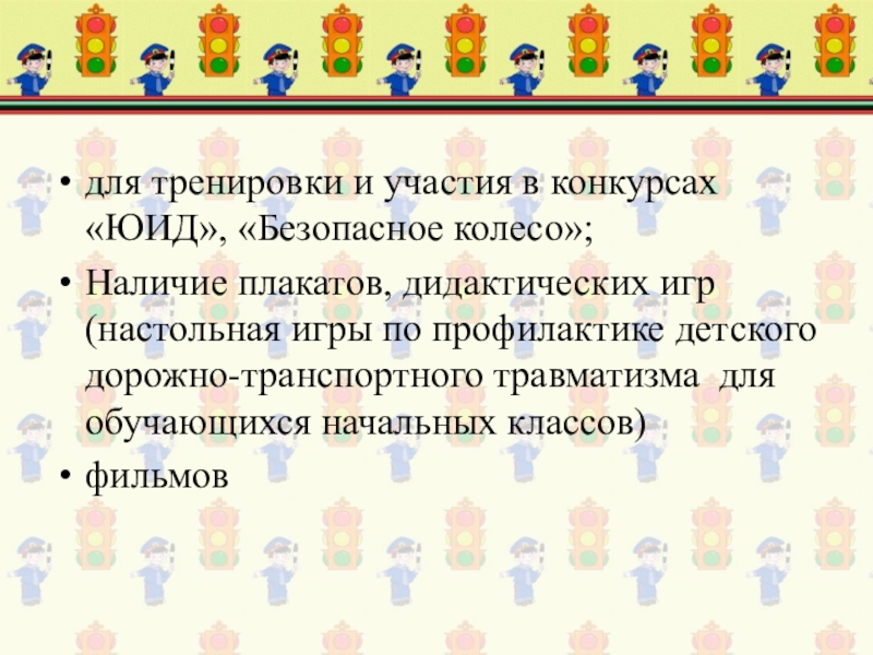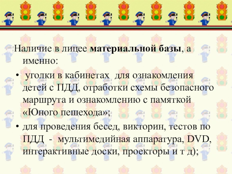 для проведения бесед, викторин, тестов по ПДД - мультимедийная аппаратура, DVD, интерактивные доски, проекторы и т д);