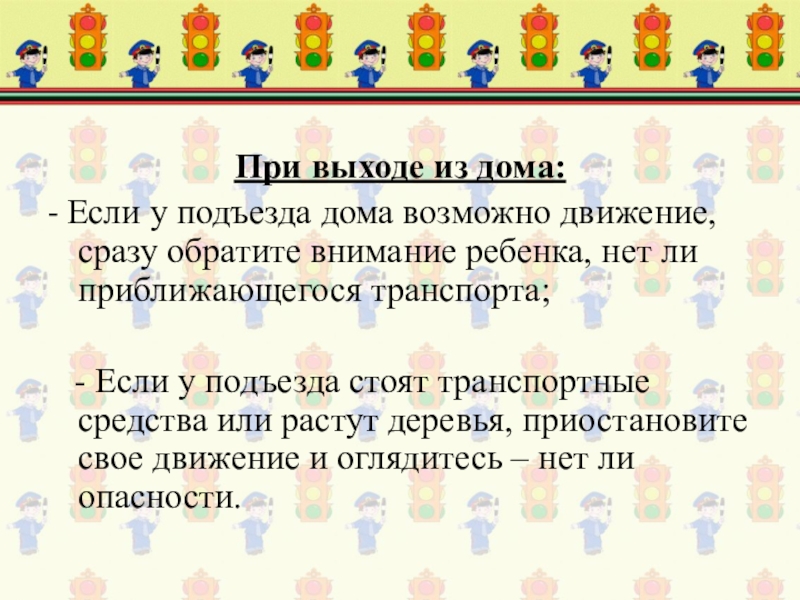 Не выходите на проезжую часть с ребенком из-за транспорта или кустов, не осмотрев предварительно улицу;
