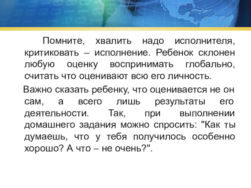 Помните, хвалить надо исполнителя, критиковать – исполнение. Ребенок склонен