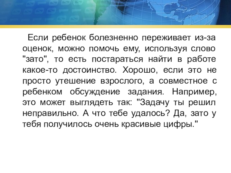 используя слово "зато", то есть постараться найти в работе какое-то достоинство. Хорошо, если это не просто утешение взрослого, а совместное с ребенком обсуждение задания. Например, это может выглядеть так: "Задачу ты решил неправильно. А что тебе удалось? Да, зато у тебя получилось очень красивые цифры."