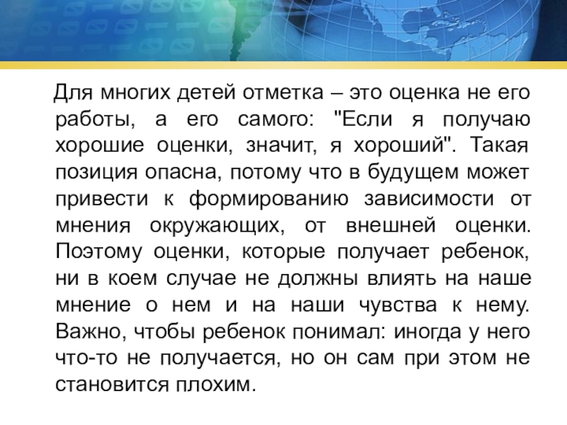 работы, а его самого: "Если я получаю хорошие оценки, значит, я хороший". Такая позиция опасна, потому что в будущем может привести к формированию зависимости от мнения окружающих, от внешней оценки. Поэтому оценки, которые получает ребенок, ни в коем случае не должны влиять на наше мнение о нем и на наши чувства к нему. Важно, чтобы ребенок понимал: иногда у него что-то не получается, но он сам при этом не становится плохим.
