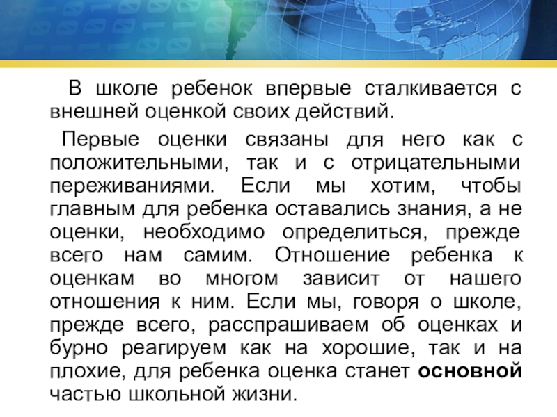 Первые оценки связаны для него как с положительными, так и с отрицательными переживаниями. Если мы хотим, чтобы главным для ребенка оставались знания, а не оценки, необходимо определиться, прежде всего нам самим. Отношение ребенка к оценкам во многом зависит от нашего отношения к ним. Если мы, говоря о школе, прежде всего, расспрашиваем об оценках и бурно реагируем как на хорошие, так и на плохие, для ребенка оценка станет основной частью школьной жизни.