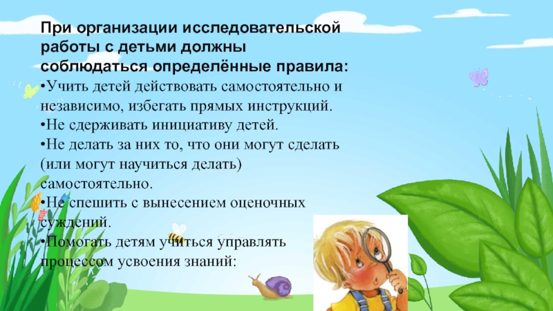 Слайд 6При организации исследовательской работы с детьми должны соблюдаться определённые правила: