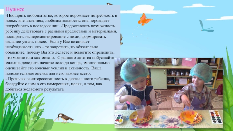 потребность в исследовании. -Предоставлять возможность ребенку действовать с разными предметами и материалами, поощрять экспериментирование с ними, формировать желание узнать новое. -Если у Вас возникает необходимость что – то запретить, то обязательно объясните, почему Вы это делаете и помогите определить, что можно или как можно. -С раннего детства побуждайте малыша доводить начатое дело до конца, эмоционально оценивайте его волевые усилия и активность. Ваша положительная оценка для него важнее всего.