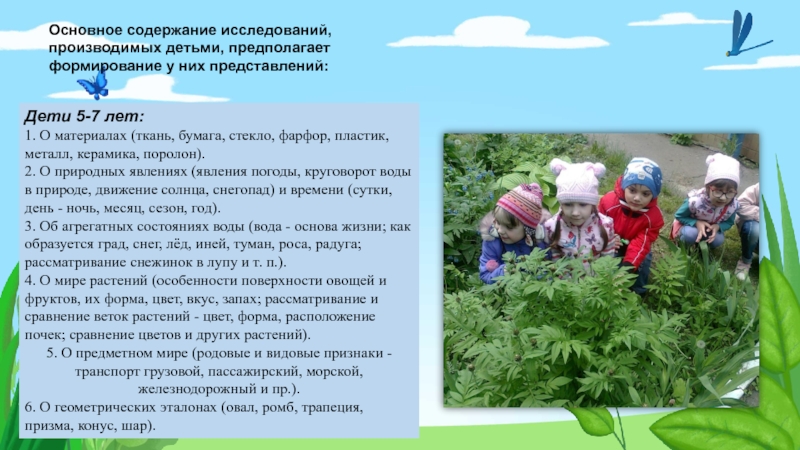 Слайд 4Основное содержание исследований, производимых детьми, предполагает формирование у них представлений:
