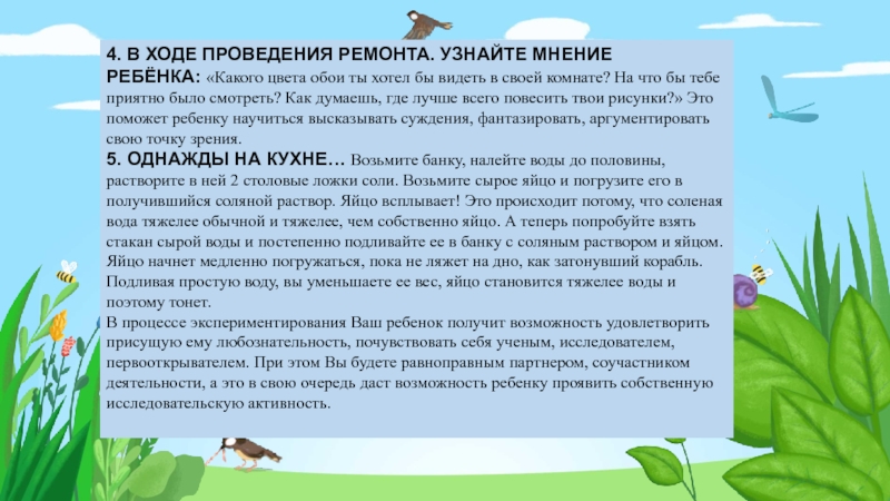 В процессе экспериментирования Ваш ребенок получит возможность удовлетворить присущую ему любознательность, почувствовать себя ученым, исследователем, первооткрывателем. При этом Вы будете равноправным партнером, соучастником деятельности, а это в свою очередь даст возможность ребенку проявить собственную исследовательскую активность.