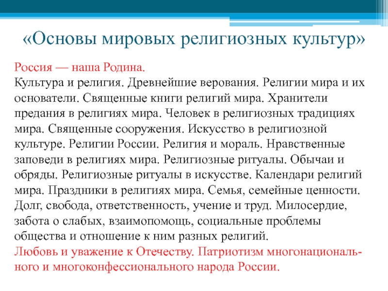 Религии мира и их основатели. Священные книги религий мира. Хранители предания в религиях мира. Человек в религиозных традициях мира. Священные сооружения. Искусство в религиозной культуре. Религии России. Религия и мораль. Нравственные заповеди в религиях мира. Религиозные ритуалы. Обычаи и обряды. Религиозные ритуалы в искусстве. Календари религий мира. Праздники в религиях мира. Семья, семейные ценности. Долг, свобода, ответственность, учение и труд. Милосердие, забота о слабых, взаимопомощь, социальные проблемы общества и отношение к ним разных религий.