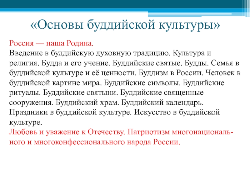 и религия. Будда и его учение. Буддийские святые. Будды. Семья в буддийской культуре и её ценности. Буддизм в России. Человек в буддийской картине мира. Буддийские символы. Буддийские ритуалы. Буддийские святыни. Буддийские священные сооружения. Буддийский храм. Буддийский календарь. Праздники в буддийской культуре. Искусство в буддийской культуре.