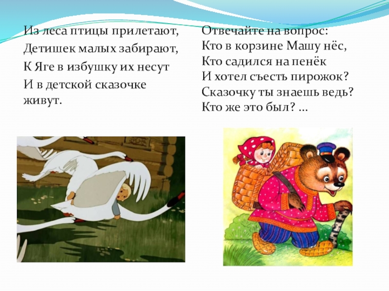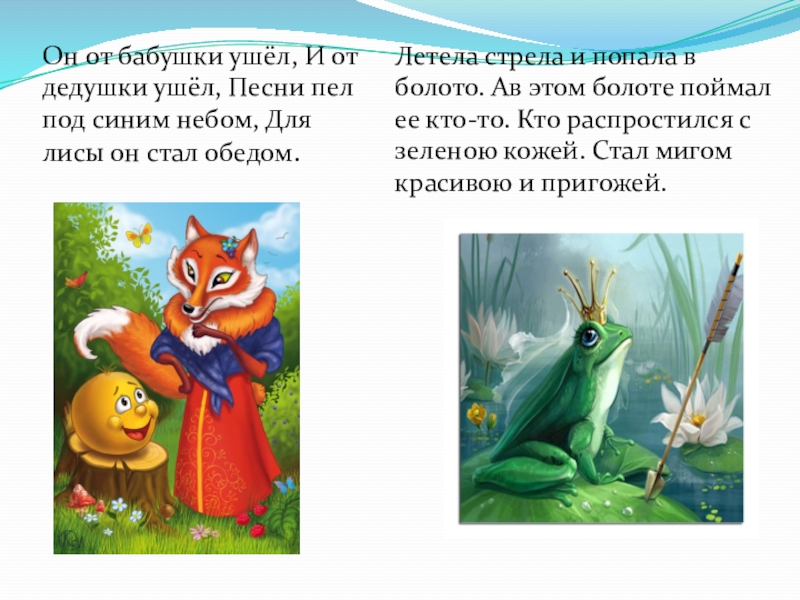Летела стрела и попала в болото. Ав этом болоте поймал ее кто-то. Кто распростился с зеленою кожей. Стал мигом красивою и пригожей.