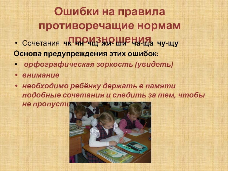 Ошибки на правила противоречащие нормам произношенияСочетания чк чн чщ жи- ши  ча-ща чу-щуОснова предупреждения этих ошибок: