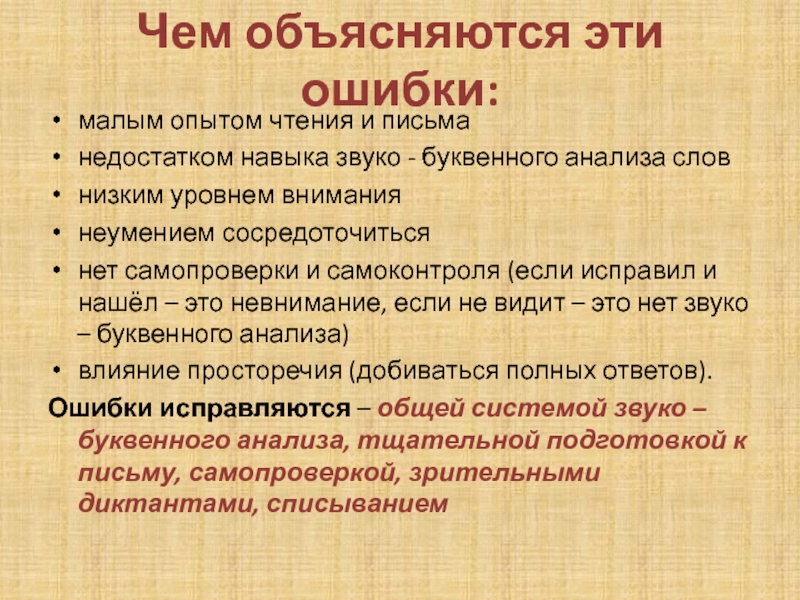 Чем объясняются эти ошибки:малым опытом чтения и письманедостатком навыка звуко - буквенного анализа словнизким уровнем вниманиянеумением сосредоточитьсянет