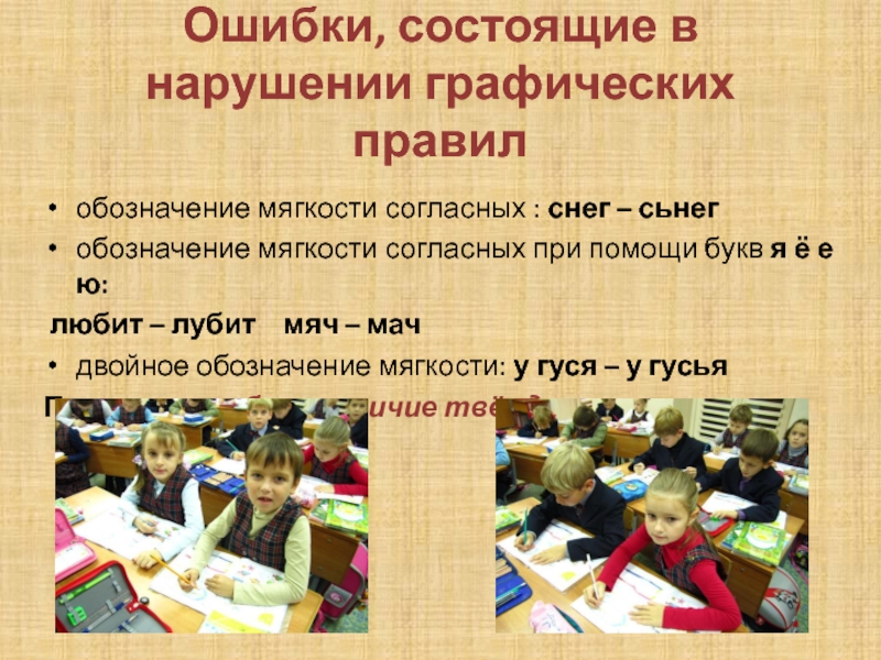 Ошибки, состоящие в нарушении графических правилобозначение мягкости согласных : снег – сьнегобозначение мягкости согласных при помощи букв