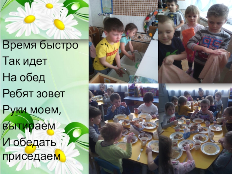 Время быстро Так идетНа обед Ребят зоветРуки моем,вытираемИ обедать приседаем