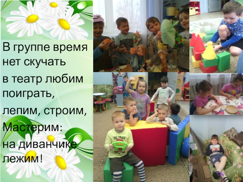 В группе время нет скучатьв театр любим поиграть,лепим, строим,Мастерим:на диванчике лежим!