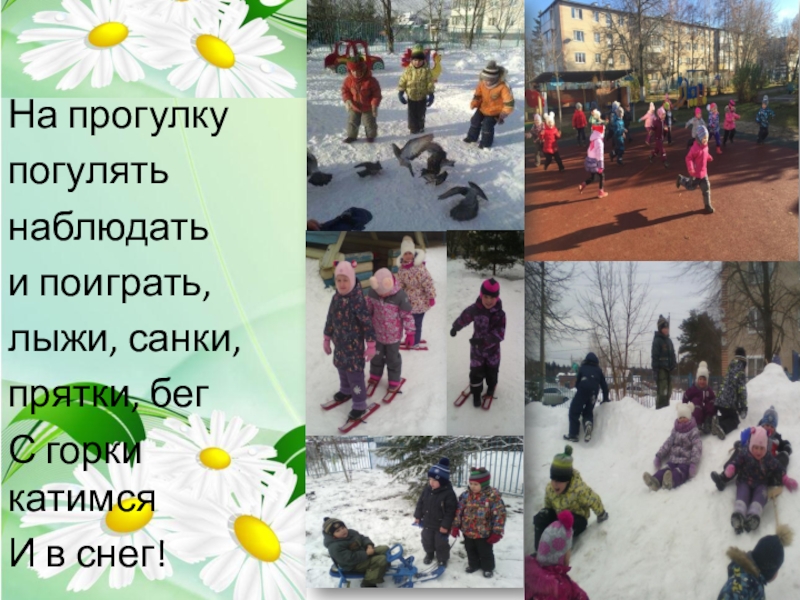 На прогулкупогулятьнаблюдатьи поиграть,лыжи, санки,прятки, бегС горки катимсяИ в снег!
