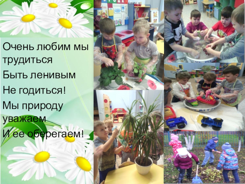 Очень любим мы трудитьсяБыть ленивымНе годиться!Мы природу уважаемИ ее оберегаем!