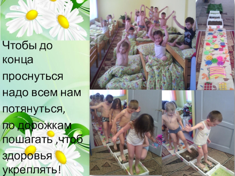 Чтобы до конца проснутьсянадо всем нампотянуться,по дорожкам пошагать ,чтобздоровья укреплять!