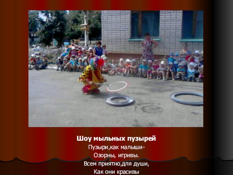 Шоу мыльных пузырейПузыри,как малыши-Озорны, игривы.Всем приятно,для души,Как они красивы