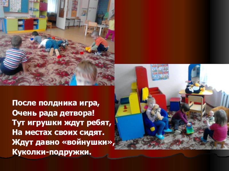 После полдника игра,Очень рада детвора! Тут игрушки ждут ребят,На местах своих сидят.Ждут давно «войнушки»,Куколки-подружки.
