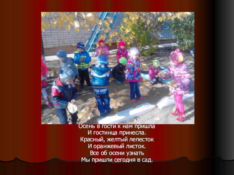 Осень в гости к нам пришлаИ гостинца принесла.Красный, желтый лепестокИ оранжевый листок.Все об осени узнатьМы пришли сегодня