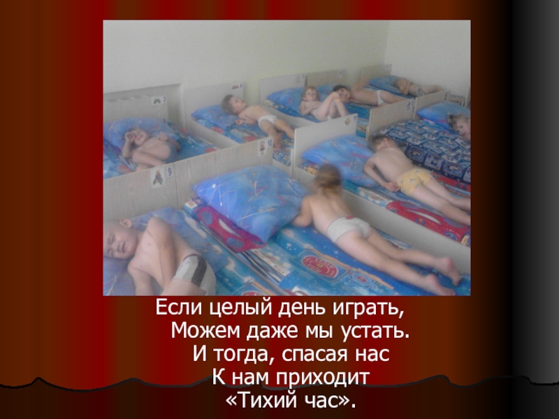 Если целый день играть, Можем даже мы устать. И тогда, спасая нас К нам приходит «Тихий час».