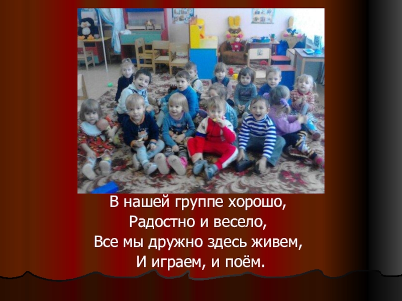 В нашей группе хорошо,Радостно и весело,Все мы дружно здесь живем, И играем, и поём.