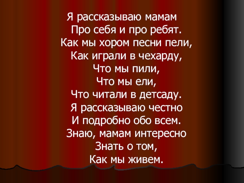 Я рассказываю мамам  Про себя и про ребят.  Как мы хором песни пели,  Как играли в чехарду,  Что мы пили,  Что мы ели,  Что читали в детсаду.  Я рассказываю честно  И подробно обо всем.  Знаю, мамам