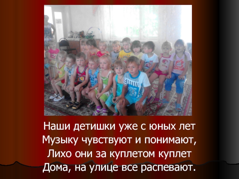 Наши детишки уже с юных лет Музыку чувствуют и понимают, Лихо они за куплетом куплет Дома, на