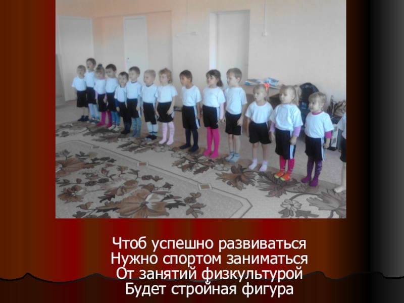 Чтоб успешно развиваться Нужно спортом заниматься От занятий физкультурой Будет стройная фигура