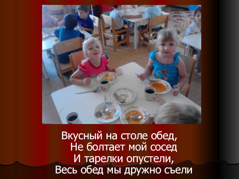 Слайд 7Вкусный на столе обед,  Не болтает мой сосед  И тарелки опустели,  Весь обед мы