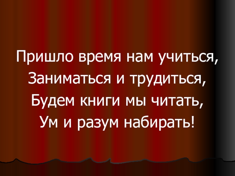 Пришло время нам учиться,Заниматься и трудиться,Будем книги мы читать,Ум и разум набирать!