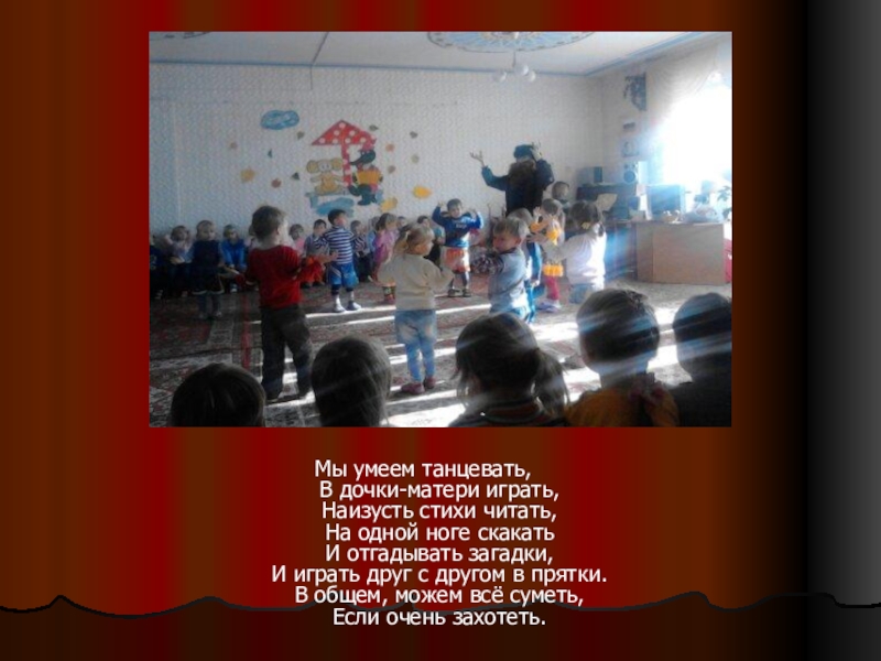 Слайд 23Мы умеем танцевать, В дочки-матери играть, Наизусть стихи читать, На одной ноге скакать И отгадывать