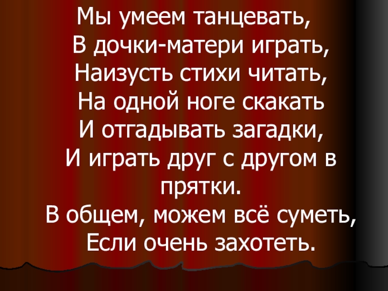 Мы умеем танцевать, В дочки-матери играть, Наизусть стихи читать, На одной ноге скакать И отгадывать загадки, И